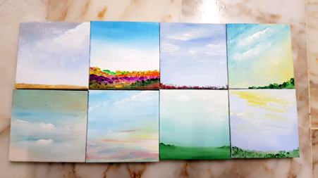 I like to paint the blue sky. It’s a different story, every time. I suppose as a young child with both working parents, looking at the sky and making up stories helped me to pass time. When I paint, I see the clouds bringing peace and calm going forward.